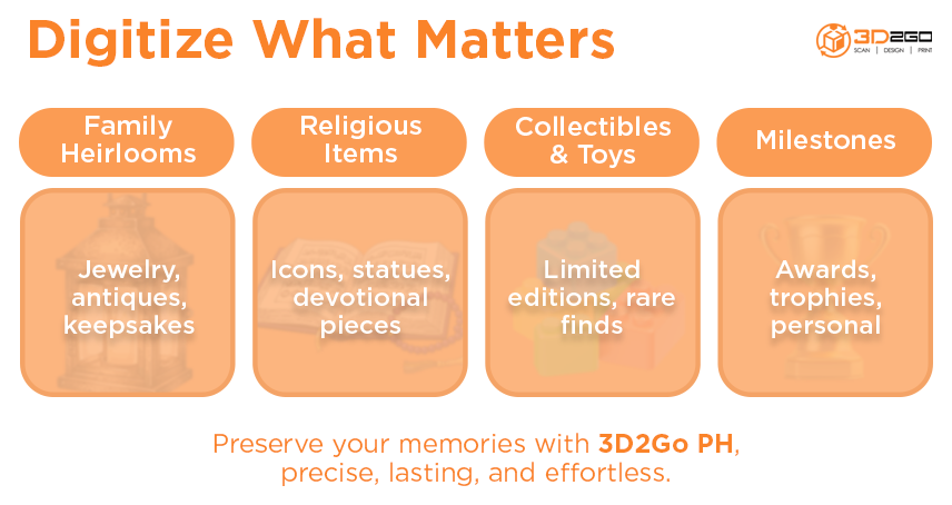 Don’t leave your treasured items to time or chance. Start digitizing with 3D2Go PH today: Contact Us