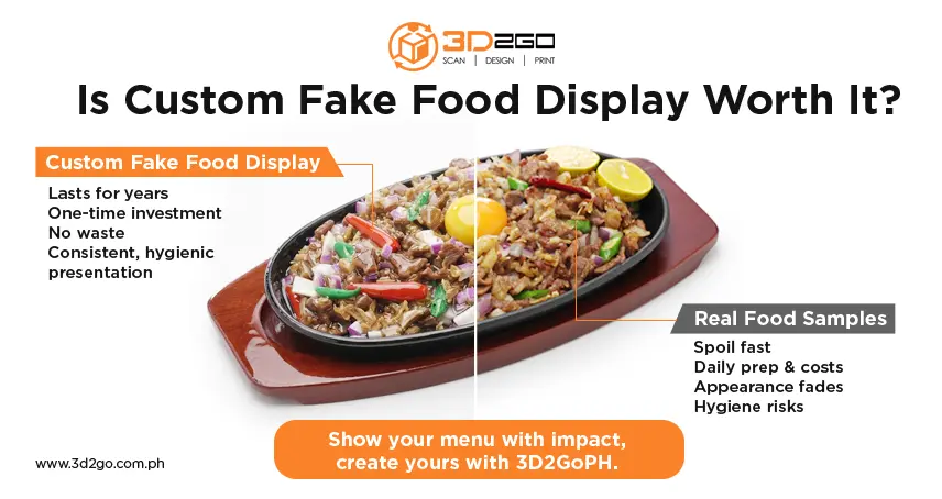 Some restaurants attempt to display real food for promotional purposes, but this approach creates ongoing problems. Real food spoils quickly, requires constant preparation, and can attract pests.