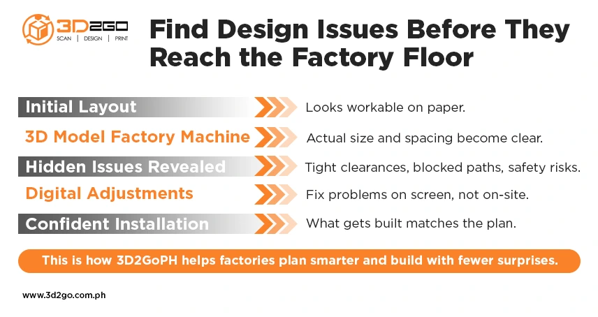 Flat layouts can’t fully show how machines interact with people, materials, and each other. Small oversights, such as a blocked maintenance path or a tight corner, can lead to costly fixes later.